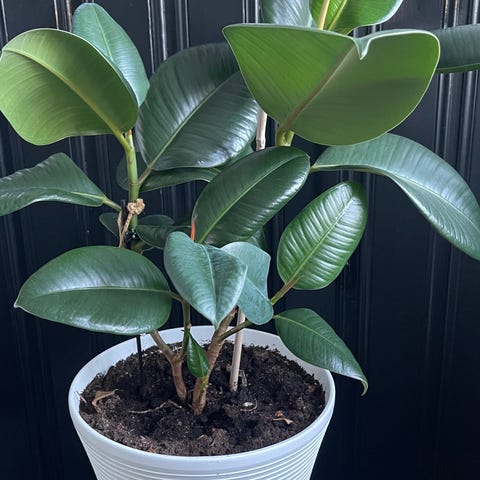 Gummifikus med stora gröna blad i en vit kruka med prickmönster runt om. Planterad i vanlig blomjord och redo att ställas direkt på golv eller balkong. Rak och fin ca 1m hög. Krukan ingår.