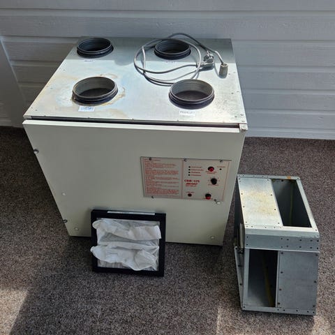 Kaminen är i rostfri aluminium, med slangar som ska in i vattnet som ska värmas upp. Öppen framtill och lösa plåtar/rördelar följer med på bilderna.