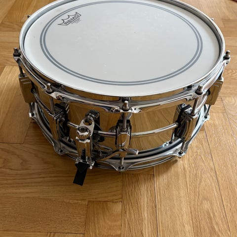 Säljer en Ludwig virvel modell: Super Sensotive Supraphonic 6.5×14 . Crome snaredrum 1970's serial. (Blue and Olive Badge). Serie nr. 1364944....