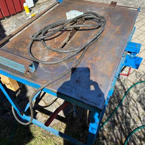 Hopfällbart arbetsbord från Calvan med röd metallstomme och träskiva. Stabil "tyngre" konstruktion men som är lätt att fälla ihop och ställa undan.