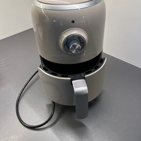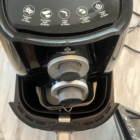 Svart airfryer från Clas Ohlson med korg och utdragbart handtag fram. Enkel ratt för tid och värme samt tydliga symboler för olika livsmedel på ovansidan.