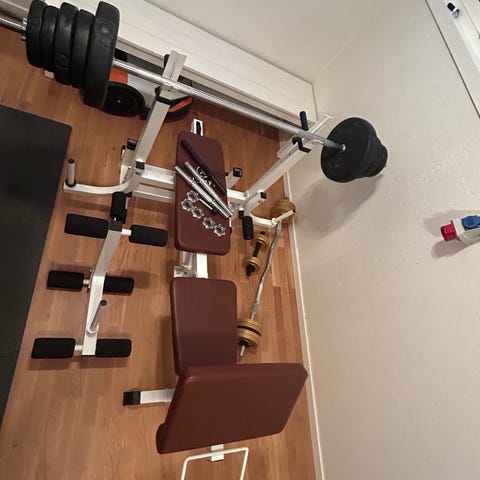 Multigym från Energetics, modell Multi 700, med röd bänk och ryggstöd. Har viktmagasin, flera dragstationer och vadderade arm- och benstöd för olika övningar. GRATIS vid snabb avhä