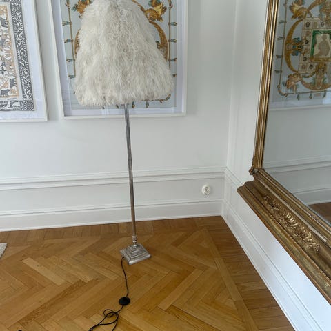 Säljer en dekorativ golvlampa med lampskärm från Kamelo. Skärmen är klädd i fjädrar (troligtvis struts), vilket ger ett mjukt och exklusivt uttryck. Lampfoten kommer från IKEA.