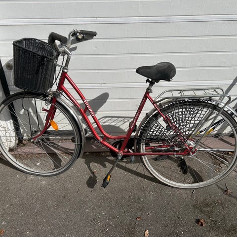 Min fina, lättrampade 7-växlade cykel säljes. Den är fullt användbar men det finns många delar som är gamla/ickefungerande och som bör bytas ut. Lampor och trampor, kedja, ringklocka, däcket bak. Sadeln också ifall men är rädd om ljusa byxor. :) Lite skev cykelkorg.