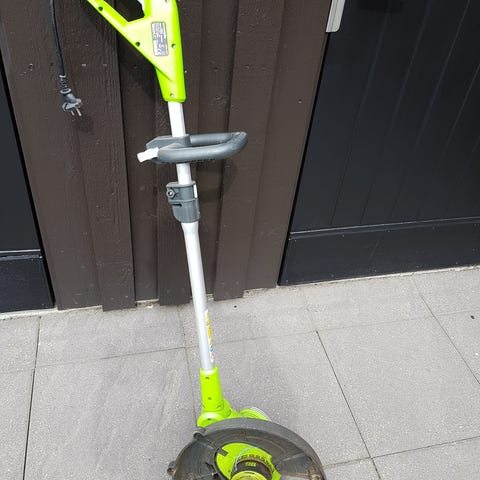 Greenworks eldriven grästrimmer med 500W motor och justerbart teleskopskaft. Har skyddskåpa runt trimmerhuvudet, extra handtag och kabelanslutning upptill för enkel användning i trädgården.