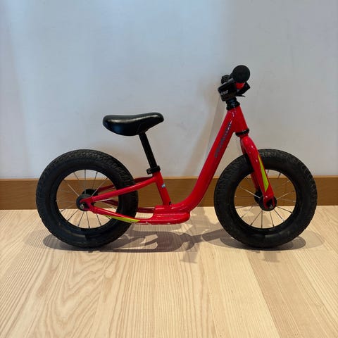 Röd/vit Woom balanscykel springcykel med 12" hjul. Utrustad med handbroms bak, ringklocka och justerbart styre och sadel.