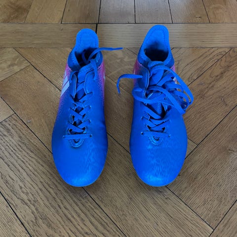 Adidas X Speedflow Messi 4 FG fotbollsskor i stl 32, blå och rosa med gula dobbar. Snörning framtill och mönstrad ovandel med Messi-tryck. Lite slitet på tyget i bak, se sista bilden. Använda av två barn. Har varit väldigt slitstarka och barnen har gillat dem.