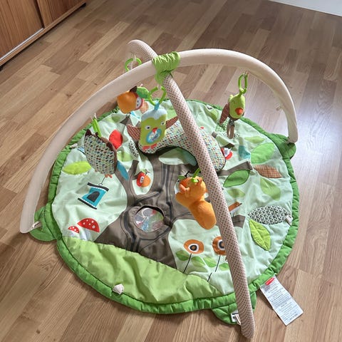 Treetop Friends fina babygym från Skip Hop inkluderar en mjuk matta, matchande kudde, mönstrade bågar, spegel samt fem leksaker att enkelt fästa på bågarna för varje steg i barnets utveckling.