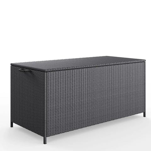 Vattentät, svart förvaringslåda Tosterö från IKEA som skyddar utomhusdynor från regn och damm.