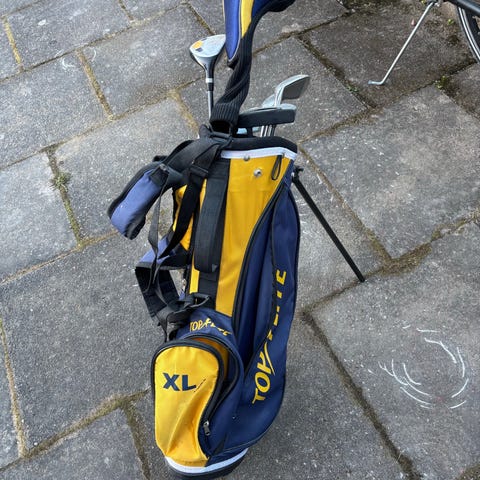 Setet inkluderar Driver, Hybrid, Järn 8, Wedge, Putter, 2st headcovers, bärbag med stativ