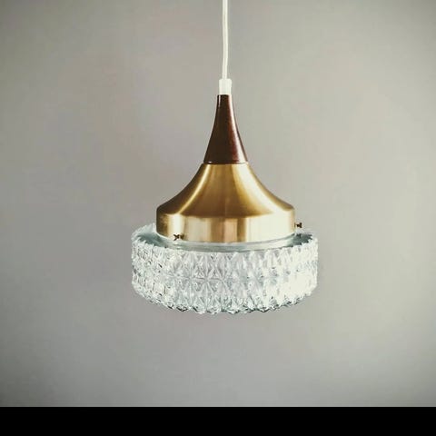 En fantastisk kombination av mässing, teak och pressat glas som ger ett otroligt vackert sken. Varje glassektion är infattad i vinklade paneler av teak, vilket ger lampan en karaktäristisk och tidlös mid-century modern-look.