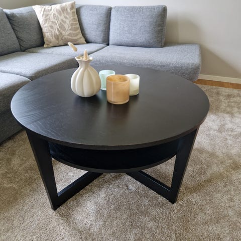Svart soffbord i stilren design säljes. Bordet är i mycket fint skick med knappt några synliga skador. Praktisk hylla undertill för förvaring.
