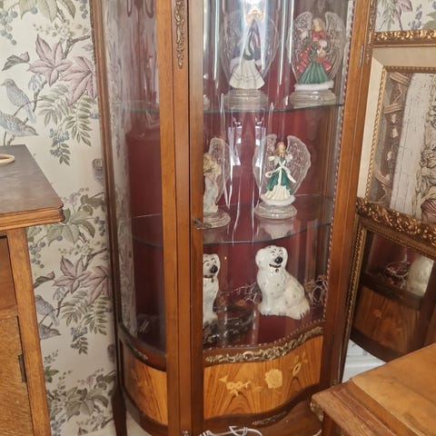 Fint vitrinskåp i mörkt trä med glasdörr och tre hyllplan för porslin eller prydnader. Har dekorativa intarsiadetaljer nertill och står på svängda ben.