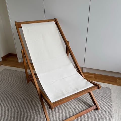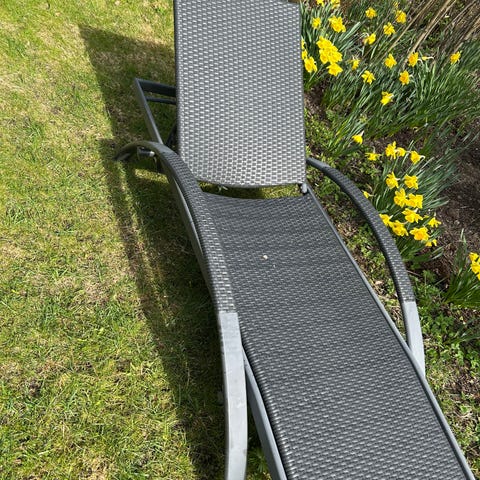 Hopfällbar solstol/relaxstol i grått med svart metallstomme. Har armstöd och snörning längs sidorna som håller tyget på plats.