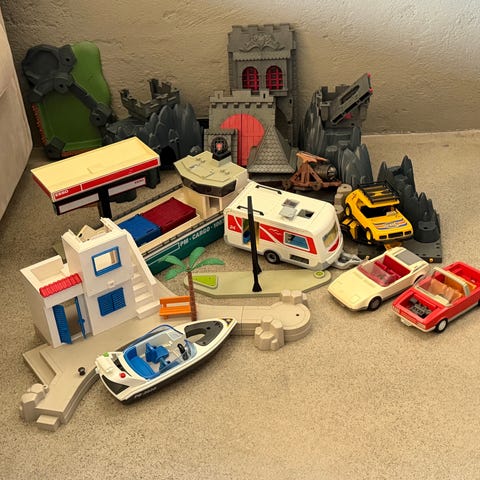 Playmobil-grejer. Slott, flygplats, helikopter, buss, brandbil, bondgård, flygplan, massa figurer osv osv.