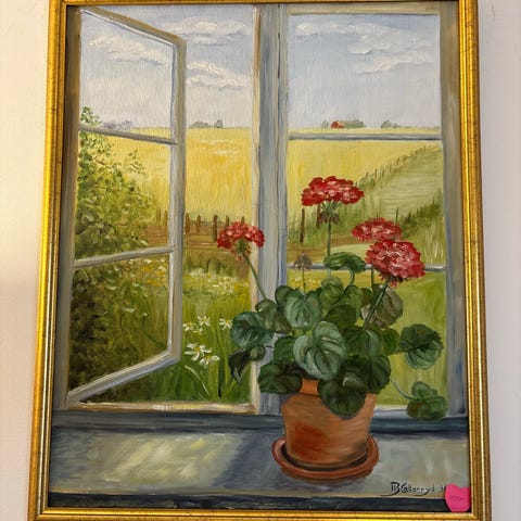 Långsmal tavla med Ölandsmotiv på duk med landskapsmotiv, bland annat väderkvarn, hus och djur i förgrunden. Signerad Bergqvist nere i hörnet.