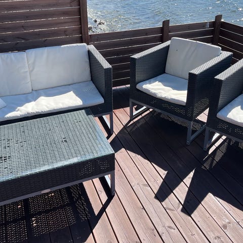Svart loungegrupp i konstrotting med 4 fåtöljer och två låga bord. Bordsskivorna är släta och fåtöljerna har raka armstöd som ger en enkel och praktisk utehörna. På bild är dem smutsiga.