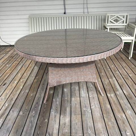 150 cm Runt matbord från Artwood ( Artwood French) i massivt trä med kraftigt kryssunderrede. Bordsskivan är uppbyggd av breda träplankor och passar bra på altan eller uteplats.