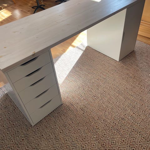 Skiva i ekfanér och stomme samt datorhållare i silvergrå metall. Hämtas omonterat. Alla nödvändiga skruvar och beslag medföljer.