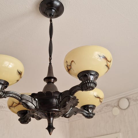 Design: Lampan har en stomme av mörkt trä, troligtvis valnöt eller liknande mörkt träslag, med svarvade ben i en spiralformad (vriden) design.