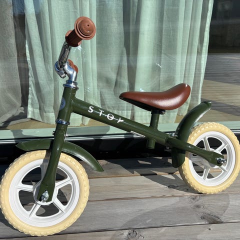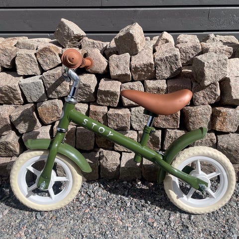 Oanvänd grön balans/springcykel 10 tum i retrostil från märket Stoy. Köpt 2024 och har förvarats inomhus i lägenheten.