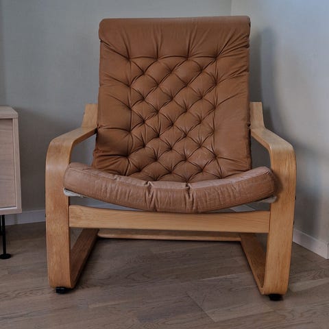 Fåtölj i rött skinn minimalistisk design. Bra skick !