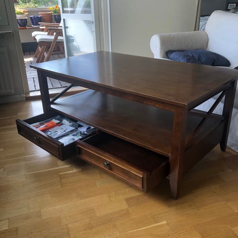 Ovalt soffbord i mörkt trä med en extra hylla under skivan. Stadiga ben och gott om plats både uppe på bordet och på hyllplanet.