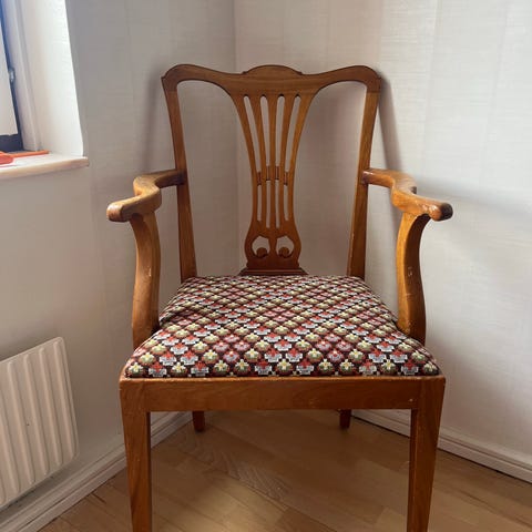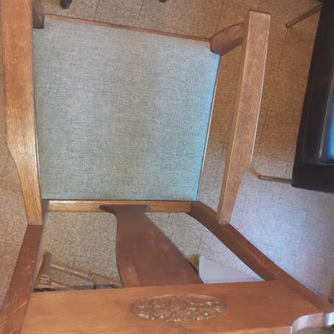 Rottingen i sitsen trasig som du ser på bilden har en skiva lagts så den går att använda m dyna, men för en händig är det en spännande utmaning att fixa