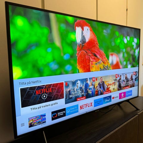 Philips smart-TV med Ambilight och flera HDMI-ingångar, 50 tum svart modell. Har smala fötter, fjärrkontroll med många snabbknappar och LED-lister monterade på baksidan.