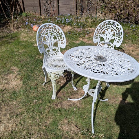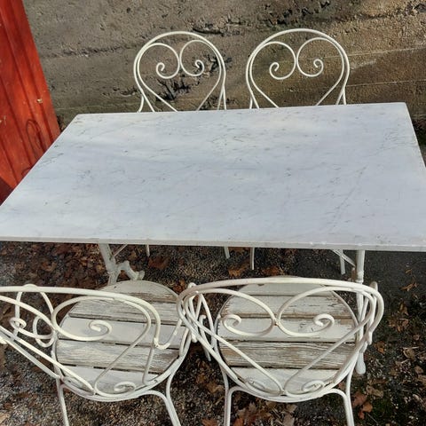 Vit trädgårdsgrupp i metall med bord, två bänkar och två stolar