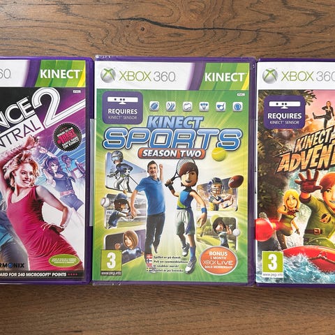 Xbox 360 Kinect-sensor tillsammans med fyra Kinect-spel: Kinect Joy Ride, Kinect Sports, Dance Central och Kinect Adventures. Fint paket för den som vill spela rörelsestyrda spel på Xbox 360.
