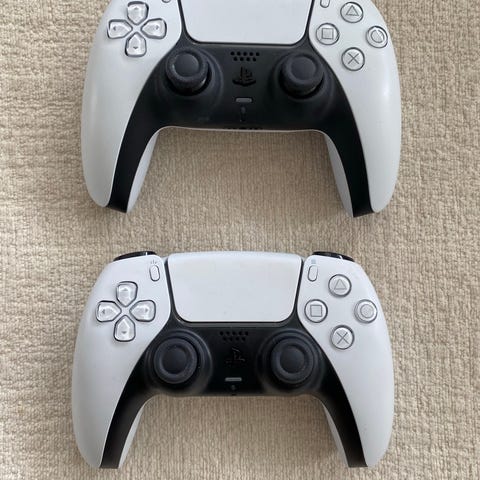 Playstation 5 med original DualSense-handkontroll, vit och svart. Visar startsida med flera installerade spel på bilderna. Av värde