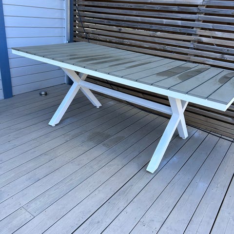 Stort trädgårdsbord i trä med mörk skiva och vit kryssformad stomme. Stabilt bord som rymmer många stolar runt om.
