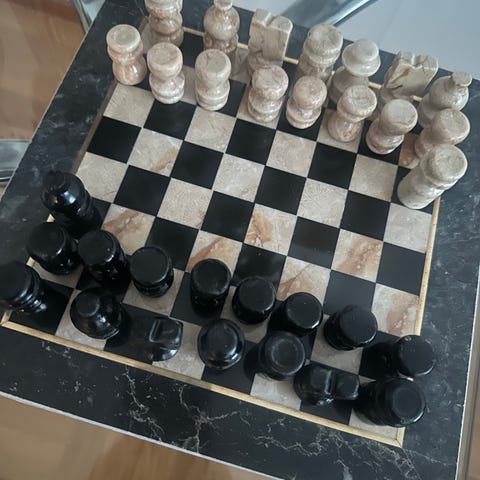 Fint schackspel med tungt marmor bräde i svart och vitt. Pjäserna i metall är detaljerade i två olika färger och står stadigt på brädet.