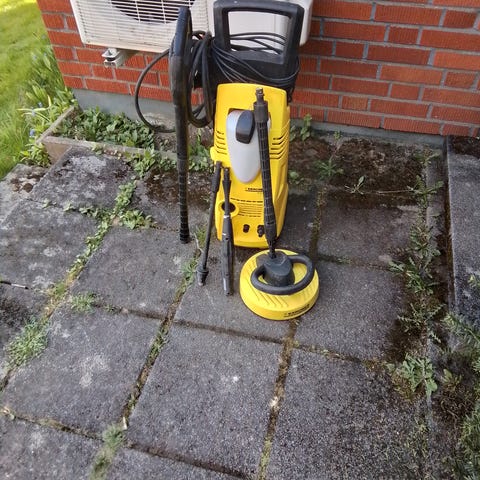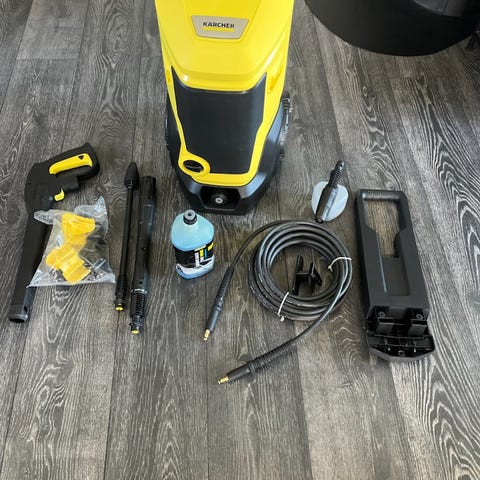 Kärcher K 5.85 högtryckstvätt med gul kåpa och svart handtag. Slang, kabel och lans sitter monterade på stativet för enkel hantering.
