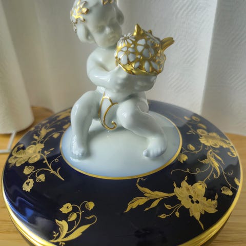 Blå Wedgwood-burk med lock och vita klassiska reliefmotiv runt om. Locket har dekor med blad i relief och burken är stämplad undertill. Diameter 7,5 cm, höjd 11 cm.
