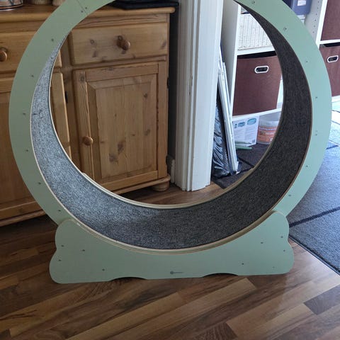 Katträningshjul i grå plast med stabil fot. Insidan har en yta som ger bra grepp när katten springer.