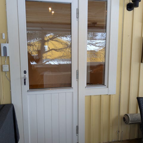 Altandörr i ytbehandlat trä med stor glasruta upptill och låshandtag. med tillhörande karm i som syns på bilden.