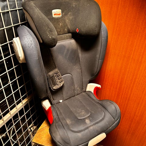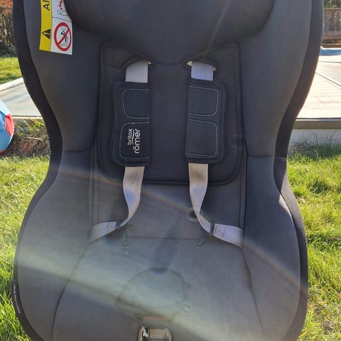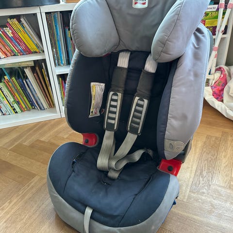 Britax Römer bilbarnstol upp till 25 kg i svart med grå internsele. Justerbart ryggstöd och flera remmar för montering i bilen. Inkluderar bruksanvisning samt även sätesskydd.