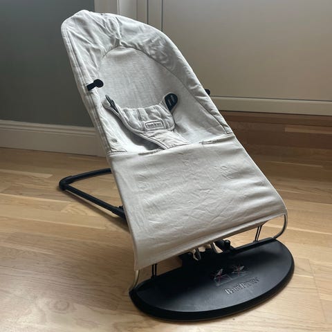 Babysitter från Babybjörn i solblekt mörkblå tyg med enkel knäppning framtill. Har justerbar sits och avtagbar tygdel som går att trä över ställningen.
