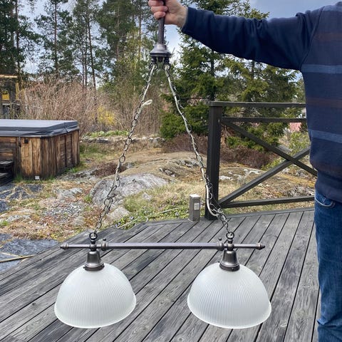 Taklampa med två ljuskällor. Lampan har en stomme i metall med dekorativa snirkliga detaljer och två vita kupor i glas. Kedja för upphängning medföljer.