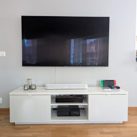 Hembyggd tv-bänk gjord av IKEA Faktum köksstommar. En del med en frostad glasdörr och en del mer en vit dörr (glasdörren gör att man kan styra TV-box genom rutan).