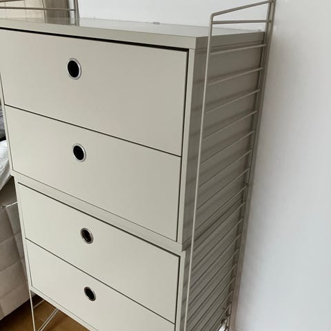 Vit vägghylla från String med tre hyllplan och gavlar i metall. Perfekt för böcker, växter och småprylar i vardagsrum eller kök.
