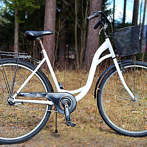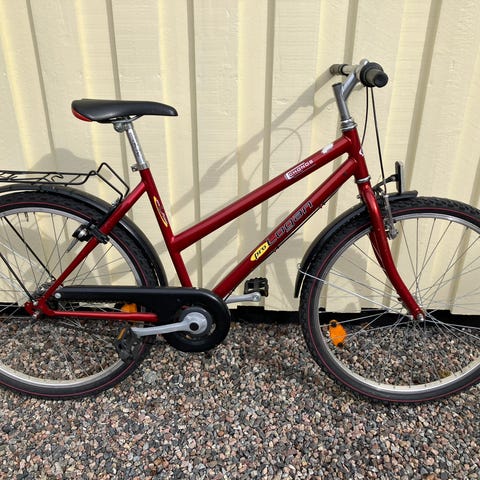 Röd sjösla stadscykel med 28" hjul och lågt insteg för dam. Utrustad med 7 växlar, pakethållare och stöd, samt handbroms fram.
