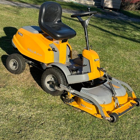 Stiga Ready åkgräsklippare i gul och grå med frontmonterat klippaggregat. Har bekväm stol, rattstyrning och stora hjul som gör den lätt att köra på gräsmattan.