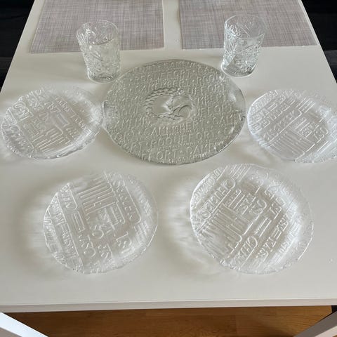 Vacker vintage ostbricka i glas från Royal Krona Bengt Edenfalk 150 kr och 4 ost tallrikar för 60 kr, paketpris tillsammans endast 190 kr