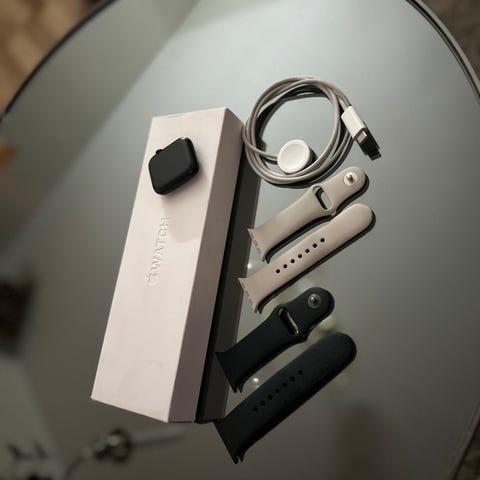 Apple Watch Series 9, 45mm Midnight GPS och Cellular med svart boett och mörkt sportband.