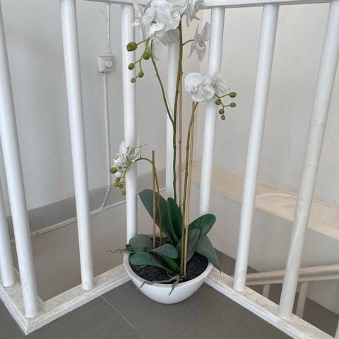 Dekorationsblommor orkidéstil i starkt rosa färg. Säljes tillsammans med genomskinlig vas som syns på bild
