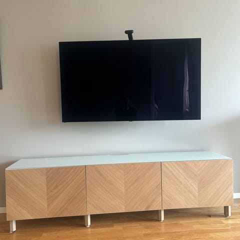 Tv-bänk Ikea Bestå-serie i svartbrun stomme med luckor och låda i svart högglans. Glasskiva upptill. Säljes pga flytt.
