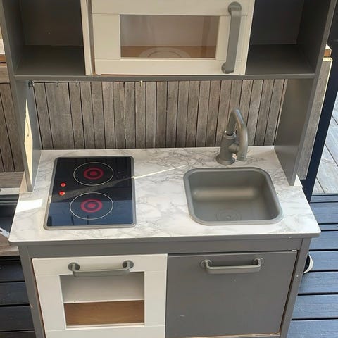Leksakskök från IKEA med spisplattor som lyser, diskho och kran. Har flera skåp och hyllor för förvaring av leksaksmat och köksprylar.